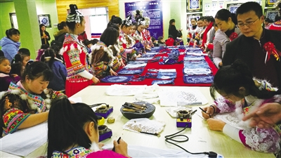 1月2日,融水苗族自治县举办首届苗族蜡染画展,展出师生以花鸟、人物、太阳、山水、芦笙柱等图案为创作内容的作品100多幅。