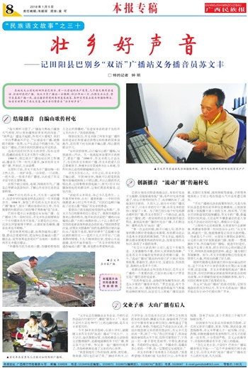 看到自己的实践经验得到肯定和推广,苏文丰为百姓服务的信心更足了。根据当地群众喜欢山歌的特点,他开始尝试着把广播的内容编成山歌。“大病小病都补助,六十以上都养老”宣传的是新农保和新农合的好处;“烧纸烧香要注意,切莫失火毁森林”说的是清明祭扫要注意防火;“遇到下冻雨,保护好耕牛”是提醒大家注意防寒防灾……党的十九大召开后,“门前喜鹊叫喳喳,十九大精神到壮家,党给山乡送温暖,农村开遍幸福花……”苏文丰将相关报道改编成山歌广播,深受群众喜爱和欢迎。