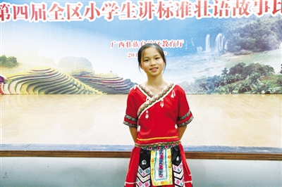 在此次参赛的孩子们眼里,黄晨馨是他们的“大姐姐”,也是学校的“小明星”。三年前,刚上三年级时,黄晨馨就在第三届全区讲标准壮语故事比赛中荣获一等奖,她2015年参加第二届全区小学生标准壮语才艺表演赛荣获二等奖,2016年参加首届全区现场壮文作文比赛荣获一等奖,此次再度参加全区讲标准壮语故事比赛,又捧回一个含金量十足的二等奖。