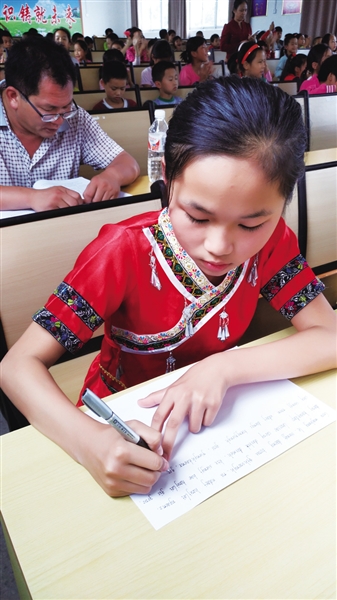 “你未来的理想是什么?”在到南宁比赛前的展演现场,面对笔者的提问,黄晨馨笑了笑,拿起笔用壮文在一张白纸上刷刷刷地写下这段话:Gou majhung le siengj dang boux yihswngh, ra ndaej haujlai ngaenz, daeuj bauqdap lauxsae caeuq daxboh daxmeh. Hix siengj bae haujlai giz youz, caiq siengj raen ndaej daengz buengjyiengh gou, gou rox angq raixcaix.(我长大了想当个医生,挣好多钱,报答老师和父母。也想去好多地方旅游,还想见到自己的偶像,我将很高兴。)