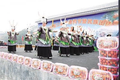 1月13日,在环江毛南族自治县思恩镇陈双村双乐苗寨,毛南、苗、瑶、壮、汉等各族群众欢聚一堂,载歌载舞庆祝砂糖橘喜获大丰收。当天,该村举办第二届砂糖橘节暨民族团结文艺联演活动,吸引了县内外上千人参加。