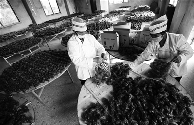 “发展红薯种植,不但能整合土地资源,把当地农民土地进行入股,还能使不少群众在家门口就可以就业。”东华村副主任肖汉强如是说,“村民每天到地里务工,可收入80多元,既增加了收入,又可以在家照顾家人。”图为1月15日东华村山头屯,两名社员在包装红薯粉。