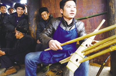 1月21日,三江侗族自治县富禄苗族乡龙奋村的村民正在制作芦笙。吹芦笙是富禄苗乡苗族同胞迎接苗族新年的一种方式,在新年来临前村村寨寨都会制作新的芦笙,邀请附近村寨参加本村举办的芦笙比赛。通过芦笙比赛祈祷来年风调雨顺、人丁兴旺,同时也通过赛芦笙、跳踩堂舞促进村寨之间的交流,维护民族团结社会稳定。