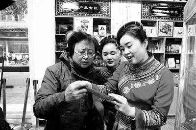 图为该邮局工作人员在给游客介绍民族文创产品。(通讯员 韦 睿 摄)