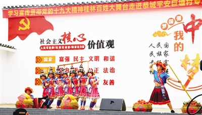 据悉,为使党的十九大精神深入人心,桂林市学习宣传贯彻党的十九大精神专题文艺宣讲先后走进了桂林雁山区草坪回族乡、兴安县溶江镇等乡镇。