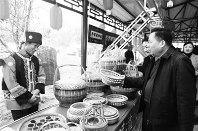 图为村民在扶贫产品展销活动中展出具有民族特色的手工艺品。