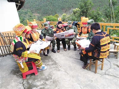 3月9日,武警宁明县边防大队爱店边防派出所官兵深入边境辖区堪爱村丈鸡屯向瑶族同胞宣传全国“两会”最新精神。