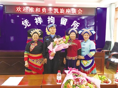 3月12日,崇左市公安边防支队凭祥拘留所隆重举行欢迎中国第五支赴利比里亚维和警察防暴队凯旋仪式,迎接该所维和队员戴忠贤载誉归来!闻讯赶来的壮族“兵妈妈”们为戴忠贤献上鲜花,战友与他击掌庆祝,一幕幕欢聚的瞬间,温馨感人。