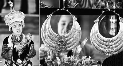 右图:在贵州省黎平县一家手工银饰店,侗族绣娘丁明焕在摆放创意刺绣银项圈等饰品(2月6日摄)。当地发展文化创意产业,鼓励和扶持当地绣娘、手工艺人把民族刺绣、银饰等设计成为具有当地文化特色的商品,带动群众致富增收。(新华社)