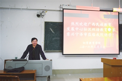 “目前,我区有36个县(市、区)开展壮汉双语教育工作,壮汉双语学校261所,其中小学224所、初中32所、高中5所,在校学生总数12万多人。”零兴宁长期深入教学一线调研指导,深谙教育规律和语言发展规律,为我区壮汉双语学校实施壮汉双语同步教学模式和多种教学模式实验做了大量、细致的基础工作,为《壮语文课程标准(试行)》《壮汉双语教育二类模式实施办法》等文件的出台提供了决策参考。