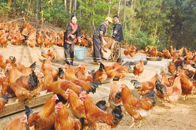 从临近狗年春节前一周至今,上林县镇圩瑶族乡东罗村敢庄山上,源发农民养殖专业合作社存栏的10万羽散养土鸡,已有6000多只以每公斤约30元的卖价畅销区内的百色、崇左等市及广东省等地。合作社负责人黄玉正高兴地告诉笔者,自2016年9月建起这个土鸡养殖场,已出栏土鸡15万羽,销售收入达1000多万元,正有力带动本地罗飞英等35个贫困户逐步走上脱贫、致富的好路子。