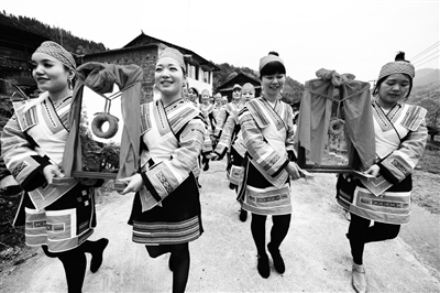 3月31日,龙胜各族自治县三门镇同烈村举行一年一度的花炮节,当地瑶族群众开展抢花炮、水田拔河、顶竹杠等具有浓郁民族风情的活动,吸引了数万名中外游客。图为瑶族同胞身着盛装参加花炮节巡游活动。