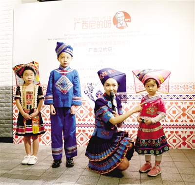 4月14日上午,在“壮族三月三”即将来临之际,南宁万象城肯德基广西民族文化主题餐厅举办了一场名为“广西尼的呀·壮族三月三”文化体验活动,到场的嘉宾“听”壮族故事、“赏”壮族服饰、“做”壮族美食,提前感受了一把“壮族三月三”的民族风俗。