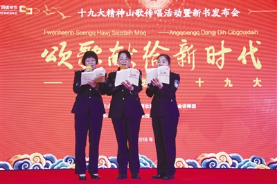 4月20日上午,在南宁国际会展中心举办的“2018广西读书节·广西书展·中国全民阅读年会”上,中共广西壮族自治区委员会讲师团、广西人民出版社联合举办十九大精神山歌传唱活动暨《颂歌献给新时代——歌唱党的十九大》新书发布会。该书以十九大报告为根本依据,创新理论宣传,从全区征集到的1600多首理论山歌中,精选300多首汇编成册,并请壮文专家翻译成壮文,以壮汉对照的形式出版。