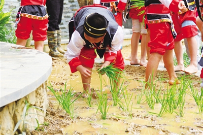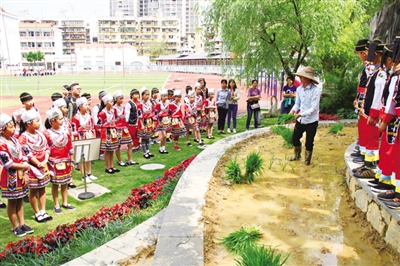 南宁市新兴民族学校以民族教育为特色,不断开发民族教育实践基地,在校园里开辟的“壮哉!壮族!”花山壁画下的三层梯田,成了孩子们了解广西壮族稻作文化,学习水稻种植知识的好场所。“一粥一饭当思来之不易,半丝半缕恒念物力维艰。孩子不出校园就能学习我们小时候干过的农活,这样的教育实实在在!比我们说多少遍节约粮食都强!”一位家长感慨地说。
