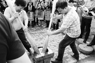 打糍粑是技术活儿,如果几个人配合不好的话,打起来是很费力气的,因为糯米的黏性很强,很容易粘在木棍上,当你的木棍上粘满了糍粑的时候,是很难扯起来的。