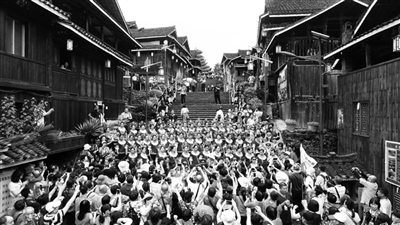 图为当地侗族群众在林溪镇冠洞村冠小侗寨拦路迎宾。