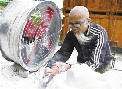 5月15日,在罗城仫佬族自治县小长安镇铜钟洞,88岁的民间艺人覃振锋正在用角磨机“刻”龙头。覃振锋在铜钟洞景区天然石头上进行创作,力争把仫佬族依饭节、舞草龙、抢竹球等仫佬族非物质文化遗产图案刻入石头,展示仫佬族传统文化的魅力文化。