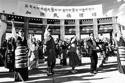 今年6月2日是西藏日喀则市第二个“民族团结进步日”。近期,日喀则开展了一系列民族团结主题活动。图为西藏日喀则市群众在民族团结主题公园内跳锅庄舞。