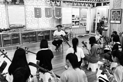 6月12日,在三江侗族自治县三江中学,学生们在学习弹唱侗族琵琶歌。近年来,该县大力推进民族文化进校园活动,通过抓师资、抓娃娃、抓课堂、抓活动等措施,将侗歌、侗绣、侗画、侗族器乐等非遗文化引入课堂,在丰富侗乡学子校园文化生活的同时,有力推动非遗技艺代代相传。图为三江中学学生在演练侗族琵琶。