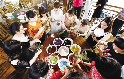 五彩粽子是壮族群众从山上找来黄饭花、紫香藤、红藤和枫叶,分别把它们捣成汁,然后用汁把糯米染成黑、紫、黄、红四种颜色,再与白色糯米一起用竹叶包制而成,不仅五彩艳丽,而且味道香软可口,深受各地游客的喜爱,也成为当地群众增收的新渠道。