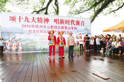6月12日,“颂十九大精神,唱新时代强音”2018年梧州市山歌擂台赛蒙山专场暨“文化和自然遗产日”宣传活动在蒙山县古榕公园举行。20多名参赛选手用蒙山白话山歌宣传十九大精神,歌颂改革开放40周年和自治区成立60周年以来,当地社会、经济等方面所取得的巨大成就和喜人变化,悠扬动听的歌声吸引了众多的山歌爱好者观看。
