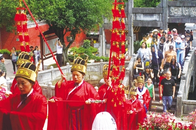 6月16日下午,众多游客在恭城瑶族自治县文庙体验祭孔仪式。