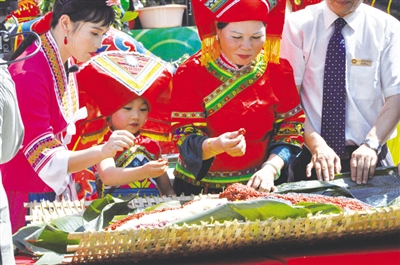 6月18日,在广西博物馆民族文物苑“粽王争霸”活动现场,两名工作人员将60斤重的“同心粽”抬上展示台展示。当日是端午节,在此举行的“粽王争霸·‘粽’享幸福”主题活动中,一个用60斤壮族传统五色糯米做成的彩虹粽“粽王”隆重亮相,它寓意着万“粽”一心、“粽”享新时代的幸福美好。群众围在“同心粽”周围品尝,纷纷点赞。