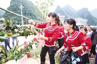 6月24日,环江毛南族自治县下南乡在南昌屯举办了一场别开生面的编织飞鸟粽比赛活动,40名编织爱好者参加了比赛。形状各异的飞鸟粽一经展示,便吸引了众多游客和群众拍照留念,成为该乡毛南族分龙节上一道亮丽的风景。