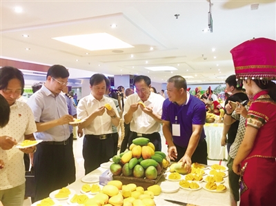 6月25日,由百色市委、市人民政府主办,市农业局、市商务局、市投资促进局、市人民政府驻北京联络处承办的2018年百色芒果(北京)专场推介会在北京市新发地农产品批发市场举行。推介会上商贾云集,宾朋满座,百色市相关领导对2018年百色芒果产业情况作了推介发言,百色、北京有关供销方均就促进百色芒果与北京市场的产销对接做了表态发言。随后,“2018年百色芒果北方市场促销活动”正式启动,将活动氛围推向高潮。会上,大家一起品香芒,叙友情,谋发展,求共赢。前来品尝和洽谈的客商络绎不绝,对百色芒果的赞誉声不绝于耳,不少来宾还以百色芒果为“模特”合影留念。