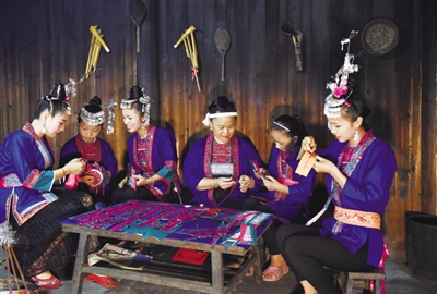 7月8日,在三江侗族自治县同乐苗族乡高培村,几名绣娘在教两名小女孩剪纸刺绣。暑期伊始,该县着力开设各类“假日学堂”,让非遗传承人或民间艺人深入基层向学生们传授侗族刺绣、侗族大歌、侗族器乐、侗族农民画等非遗技艺,使学子们在乐享多彩假日的同时,促进传承非遗文化。