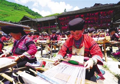 7月18日,在龙胜各族自治县龙脊镇大寨村,瑶族妇女在展示传统服饰制作工艺。 当日是农历六月初六,龙脊镇大寨村举办一年一度的晒衣节。多姿多彩的特色活动吸引众多中外游客前来领略当地民族风情。