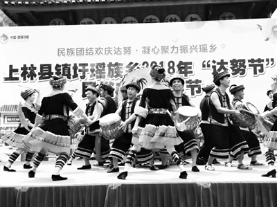 7月12日(农历五月二十九),上林县镇圩瑶族乡2018年“达努节”民俗文化旅游节在风景迷人的排岜庄隆重举行。当天,现场锣鼓喧天,游人如织,八方宾客与瑶族儿女们同歌共舞,品酒尝肉,体验瑶族同胞不一样的“新年”。图为该县瑶族同胞在表演瑶山鼓。