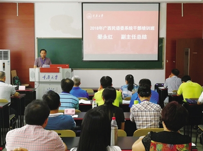 7月13日下午,2018年全区民语系统干部培训班结业典礼在重庆大学举行,历时5天的培训活动圆满结束。在结业典礼上,自治区民语委党组成员、副主任、机关党委书记翚永红作讲话并给学员们颁发结业证书。班委代表对此次培训学习进行总结。