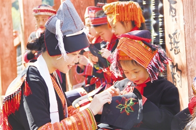 “同学们,今天学绣瑶族的八角花,从中间开始绣……”在四年级3班的瑶族织绣课上,自治区级非物质文化遗产“瑶族织绣技艺”传承人赵凤香正向孩子们传授瑶族织绣技艺,孩子们在她的指导下,一针一线、有模有样地绣了起来。“我在这里给学生上课有6年多了,学校非常重视民族文化的传承,孩子们也很乐意学习瑶绣。”赵凤香说。学校把瑶绣定为该校传承非物质文化的校本课程,多年来学生的瑶绣作品把校园装点得别具一格。