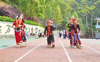 每周一节的兴趣拓展课带给孩子们快乐的时光。他们可以参加手工、编织、绘画、书法、诵读、鼓舞、刺绣、科技、合唱、大瑶山生态环境综合实践活动等各种校本活动社团,学生社团活动参与率达100%。学校还开办瑶族长鼓舞、瑶族语言等瑶族文化课程,把长鼓舞作为该校的校本操。