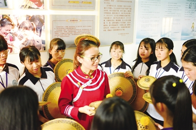 谭素娟是国家级非物质文化遗产项目花竹帽编织技艺传承人,2017年她回家乡探亲的时候,偶然间走进了下南中学,感受到了校园内浓浓的民族文化氛围。谭素娟觉得这是一个传承自身手艺的好地方,于是她很快找到了校长黄有顶,告知了自己想在校园内义务传授花竹帽编织技艺的想法。这个想法得到了校长的大力支持,并在校园内建立了一个花竹帽工作室,由谭素娟在空闲时间到校教授学生花竹帽编织技艺。“传承好这门手艺,我认为这不仅是我的义务,也是这个民族赋予我的责任。学校给我平台播撒下这门手艺的种子,相信总会有几颗能发芽,把我这门手艺永远传承下去。”这是谭素娟心里最纯真的想法。