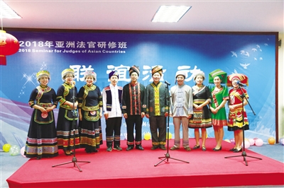 “湄公河水清又清,早上流金晚流银;山水相连情不断,亚洲国家心连心。”7月22日晚,国家法官学院广西分院灯火辉煌,歌声嘹亮,2018年亚洲法官研修班联谊活动在这里举行,广西山歌学会壮语歌队、广西警花歌队受邀为联谊活动演唱了壮汉双语山歌《迎客歌》《敬酒歌》等,靓丽的民族服装,悠扬甜美的山歌声令6国外宾赞叹不已。