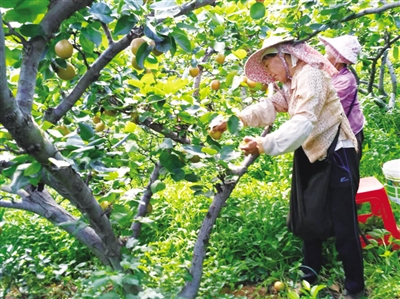 今年夏季的七月末,高温酷暑,笔者来到富川瑶族自治县葛坡镇楼村黄花梨连片种植基地,看见连片的果树上挂满了梨子。经过上前询问摘果的果农了解到,梨园主人叫邓金亮。邓金亮说:“2000年,村委进行土地整合,号召村民统一种植黄花梨果树。刚开始时我还是半信半疑,经过干部多次上门做了大量工作后,2003年春才下决心种植近20亩黄花梨。现在回想起来种黄花梨种对了,它是我们村农民致富增收的一条产业路。今年黄花梨丰产又增收,每亩产量达8000斤以上。由于我所种的黄花梨施放了农家肥,果品多汁又比较甜,梨子通过线上线下销售,按每公斤4元的价钱卖出去。目前销售已接近尾声,主要销往广东、湖南及贺州等地,梨子那么好销,收成好,今年我们家增加了近10万元收入。”