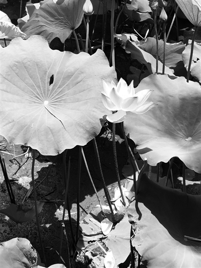 镜子般的湖面上,满是碧绿如玉的荷叶。田田的叶子铺向山间密林深处。亭亭的叶子像舞女的裙,又像孔雀开屏般闪着银光。浮在水面上的椭圆叶子,那便是睡莲。碧绿的叶子成群结伴在水面铺开,宛若柔软的绸缎静静地相连着、相拥着。叶子像一个翠绿色大玉盘,盘踞在水面上的便是世界上有着最大叶片的王莲了。它文文静静地张开巨大的叶盘,表面绵软的叶子竟能托举一个四五岁的儿童。儿童坐在玉盘上,活脱脱的成了莲花仙童。层层叶子中间,摇曳着千姿百态的莲花,有道是“出淤泥而不染,濯清涟而不妖”。有奔放盛开的,有蓓蕾初绽的,有含苞欲放的。阳光如金焰一般,热烈地泼洒在满湖的荷花上,五颜六色的荷花映着耀眼的光线婀娜多姿。粉色的荷花像一朵朵向日葵,灿烂地盛开。色彩缤纷的睡莲花,三五成群地绽放着。硕大的王莲花,魔术般变换着花的颜色。待过三五日,凋谢的莲花回归水里,“化作春泥更护花”,新的一朵莲花又吐露芬芳了。
