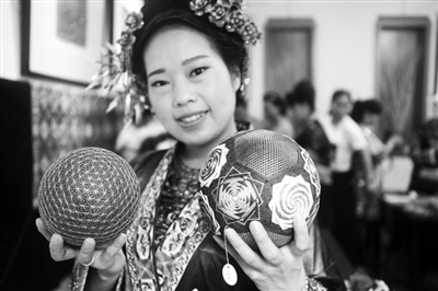 图为8月3日,在融水苗族自治县融水苗锦中心,一少数民族妇女在展示“金绣球”成品。(通讯员 廖子渊)