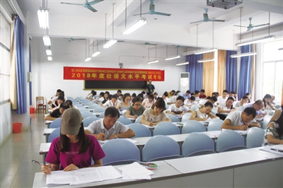 8月4日上午,2018年度壮语文水平考试在广西民族大学举行。来自南宁、柳州、防城港、钦州、贵港、百色、河池、来宾、崇左等9个市的371名考生参加了本次考试。考生以壮族为主,另有汉、瑶、苗、仫佬、毛南等民族考生。其中年龄最大的是报考高级科目的广西艺术学院退休教授农光先生(81周岁),他连续6年逐级参加了初、中、高三个等级的考试。当天,自治区民语委副主任翚永红、玉石,副巡视员余飞和广西民族大学相关领导对考试进行了巡视。