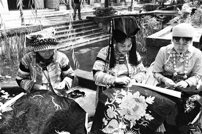8月5日,彝族民间绣娘在楚雄市彝人古镇茶花溪做绣品。当日,几十名彝族民间绣娘在云南省楚雄彝族自治州楚雄市彝人古镇茶花溪向人们展示彝族刺绣的魅力。 彝族刺绣被誉为“绽放在指尖上的花朵”。近年来,楚雄彝族自治州积极扶持彝族刺绣业发展,组织相关部门培训绣女,提高刺绣水平。