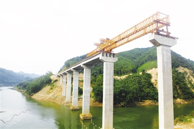 图为8月10日拍摄的融水四荣乡境内榄口在建大桥。该桥属罗(城)-洞(头)二级路融水县城连接线榄口贝江大桥。