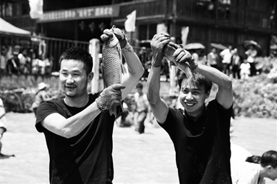图为游客和民众在参加浑水摸鱼活动。