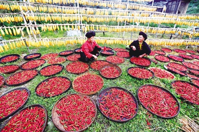 9月23日,是首届“中国农民丰收节”。龙胜各族自治县龙脊镇小寨村瑶族同胞身着节日盛装开展 “开镰”“晒秋”“敬秋”,民族服饰巡游、红瑶服饰制作工艺展示等民俗活动,与中外游客一起欢庆节日。左图为龙胜各族自治县龙脊镇小寨村,瑶族同胞在“晒秋”。(通讯员 王滋创)