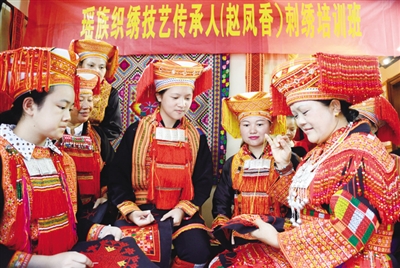 9月23日,是首届“中国农民丰收节”。在金秀瑶族自治县“妇女创业基地”,广西非物质文化遗产“瑶族织绣技艺”代表性传承人赵凤香(右一),在向学员传授瑶族织绣技艺。
