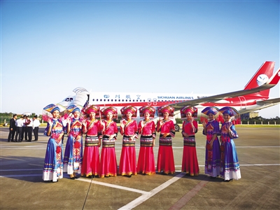 图为穿着壮族服装的少女欢迎乘客乘坐百色至北京航班。