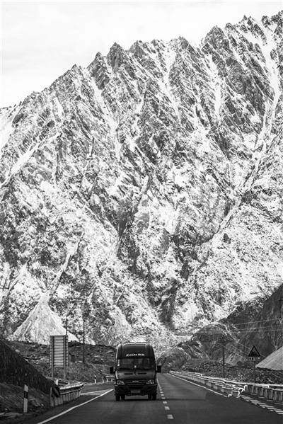 图为满载网购商品的快递车行驶在由喀什市区通往塔什库尔干塔吉克自治县县城的314国道上(11月7日无人机拍摄)。
