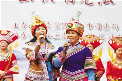 活动中,歌手们以通俗易懂、便于传唱的山歌宣传宪法,《少年山歌唱法治》《三句半·黑恶势力要打倒》《法治中国大家唱》《司法行政惠民生》《遵规守法平安路长》等法治文艺节目受到现场观众的热烈欢迎,市民在欢乐的笑声中受到了生动的法治教育。
